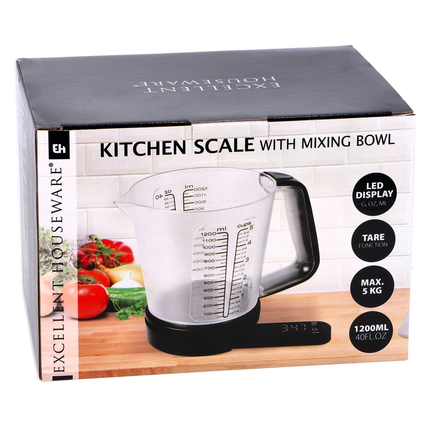 Deze set van keukenweegschaal met mengkom in 1 is onmisbaar in de keuken! De mengkom van Excellent Houseware heeft maataanduidingen van cups, ml en oz. Er past tot 1200 ml inhoud in de mengkom. De weegschaal heeft een LED display die je gemakkelijk weer onder de mengkom kunt schuiven. Werkt op 2 AAA-batterijen, deze worden niet meegeleverd.